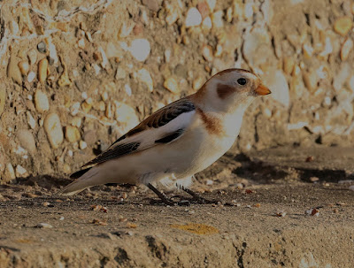 Weather forecast was for sunshine and showers so I decided on a trip to North Blyth to see if I could connect with the Snow buntings again ,on my way down to where I had seen them before I could see that the sun was going to cause me problems as it was nearly into my face . I had just finished putting some seed out when eight buntings landed on the concrete wall further on I waited a while but they seemed content to stay where they were so I walked round to get the sun in a better position and managed a couple of early shots,I then moved back to my original position keeping the wall in the background to try for better pictures .
